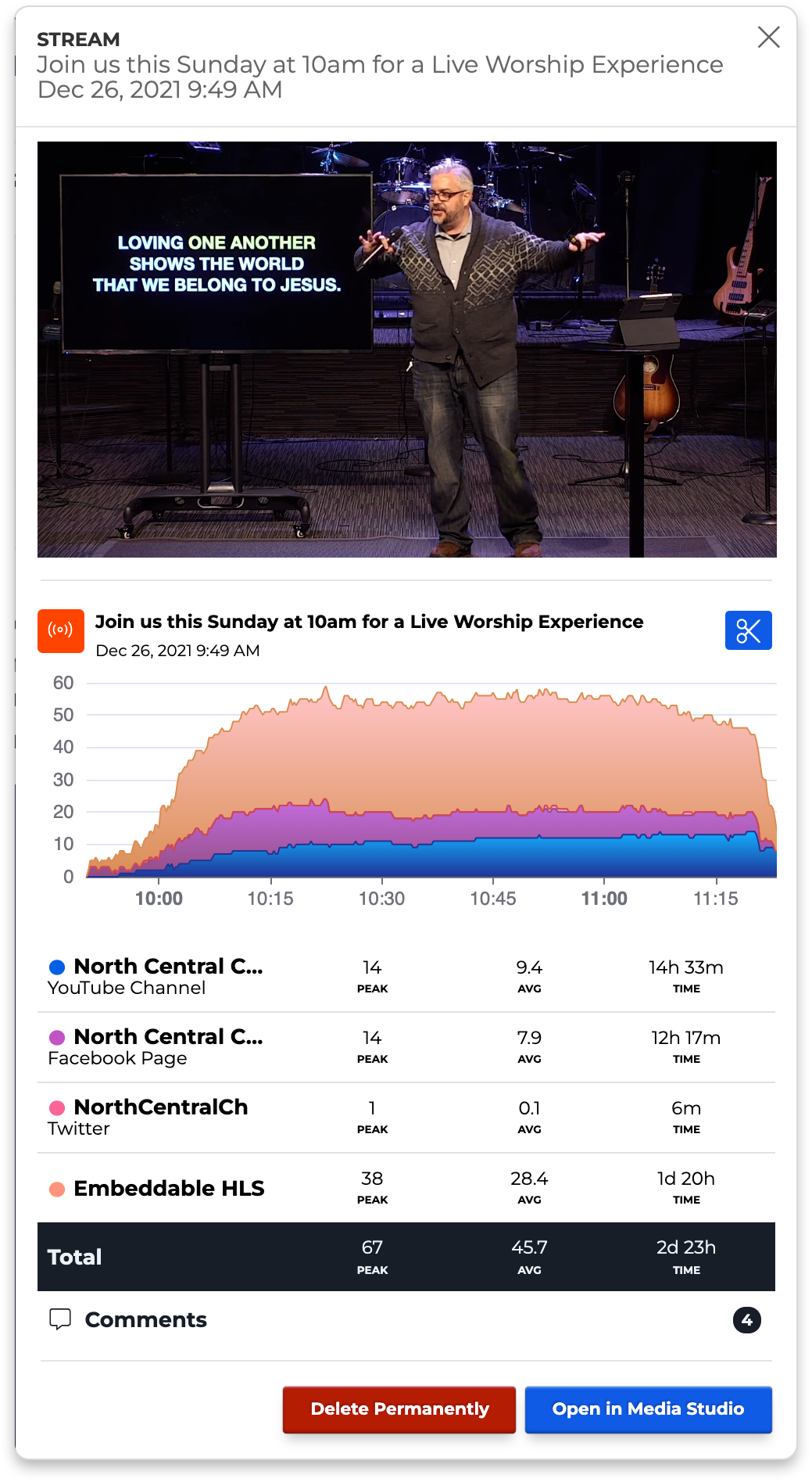 See which platforms your congregation is watching your streams on, how long they are watching and see comments and reactions as they happen.
