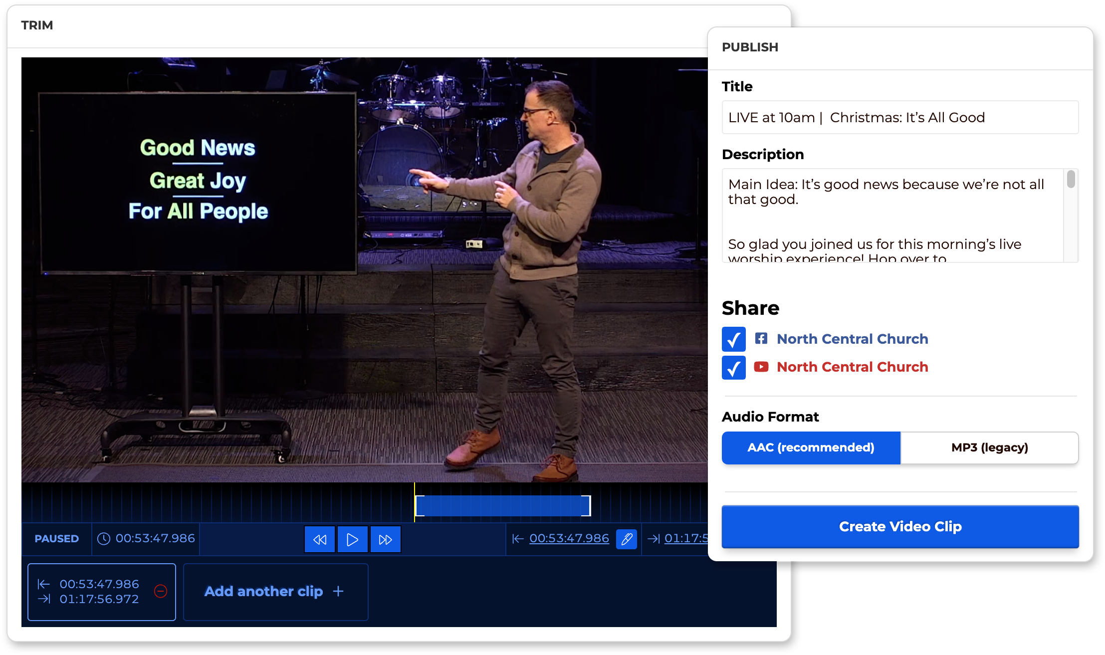 It couldn't be easier to produce your on-demand video archives. Don't stay hours after a service: importing video, editing the video, waiting for an export to finish, then waiting for uploads to finish.